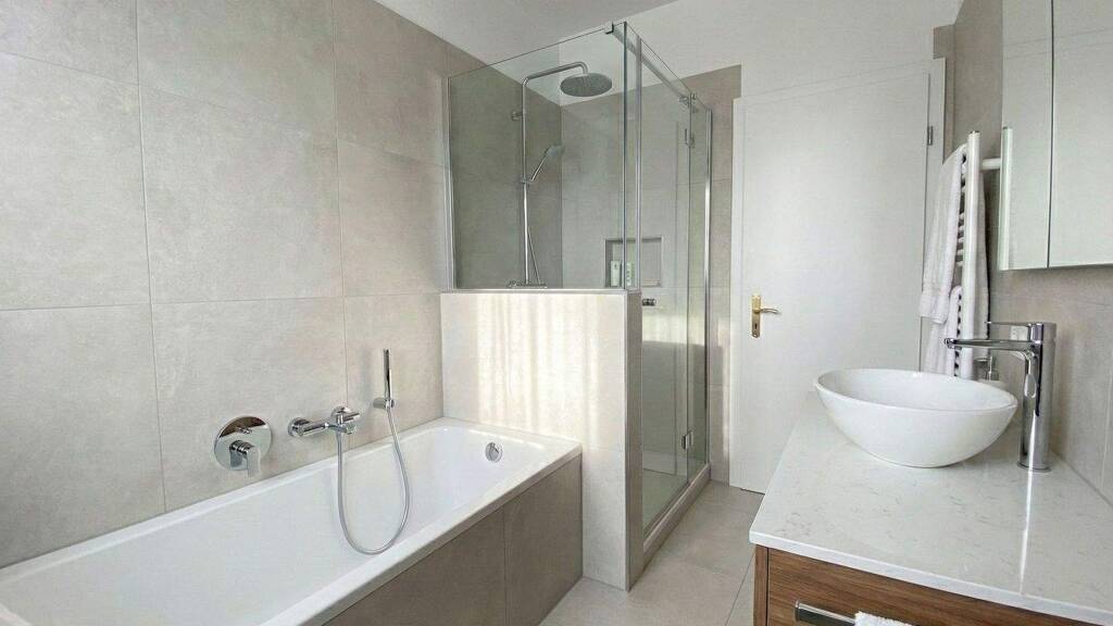 Das Tageslicht-Badezimmer ist mit sowohl Badewanne als auch Dusche praktisch ausgestattet.
