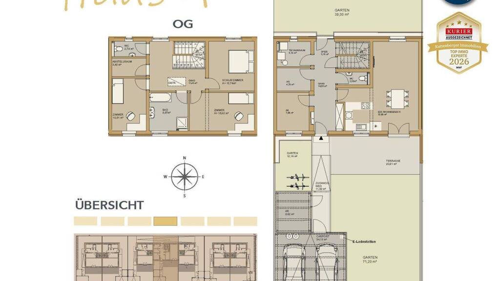 Diese Einheit ist als Reihemittelhaus konzipiert und zählt mit einer Wohnnutzfläche von ca. 141,30 m² zu den größten Einheiten der Anlage. Der offene Wohn- und Essbereich mit ca. 32,7 m² bildet den Mittelpunkt des Hauses und führt direkt auf die Terrasse und in den Garten. Im Erdgeschoss befindet sich überdies auch ein kleines Zimmer mit 7,98 m² (Abstellraum) welches als Arbeitszimmer oder kleines Gästezimmer Verwendung finden könnte.
