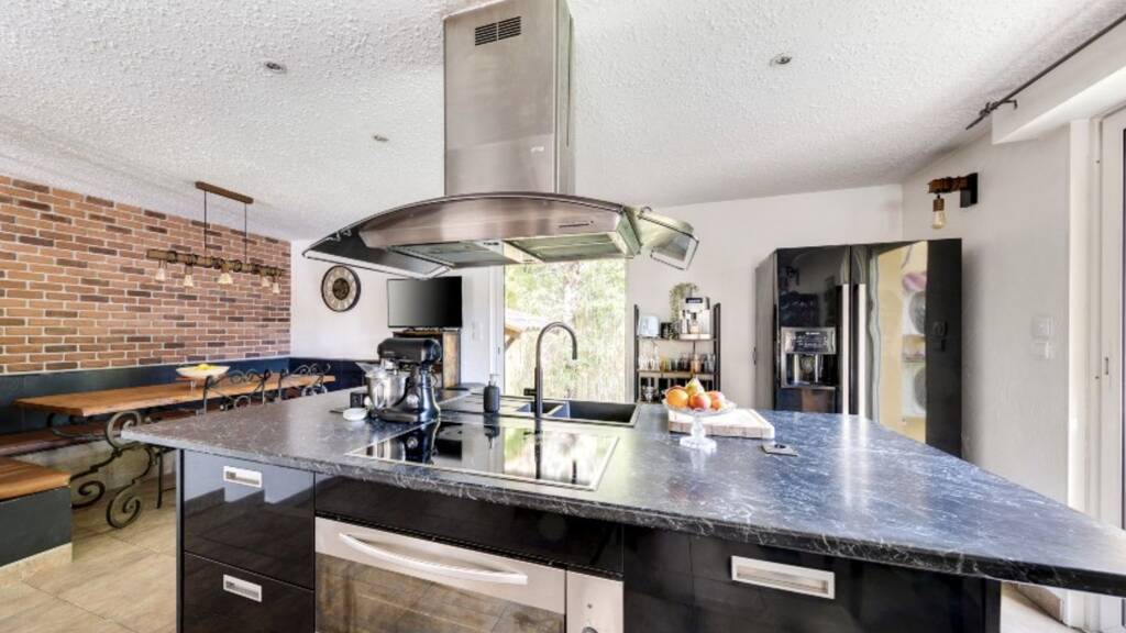 Within, the main entrance and hall lead to a beautiful, generously proportioned living area organised on half-levels, with a total surface area of 125m2. The kitchen, fitted with a central island and dining area, opens onto the dining room; this slightly raised area harmoniously overlooks the double living room. The spacious and bright main lounge is centred around a fireplace, bringing charm and warmth to the room. Slightly below, accessible by a step, a separate relaxation area creates a more intimate atmosphere, furnished as a lounge-bar with a library, sofa and games area. The whole area is an ideal place for entertaining or enjoying moments of conviviality with family or friends. Large openings allow the lounge to extend onto the terrace and pool area, creating a harmonious continuity between indoors and outdoors. This level also includes a bedroom and guest toilet.