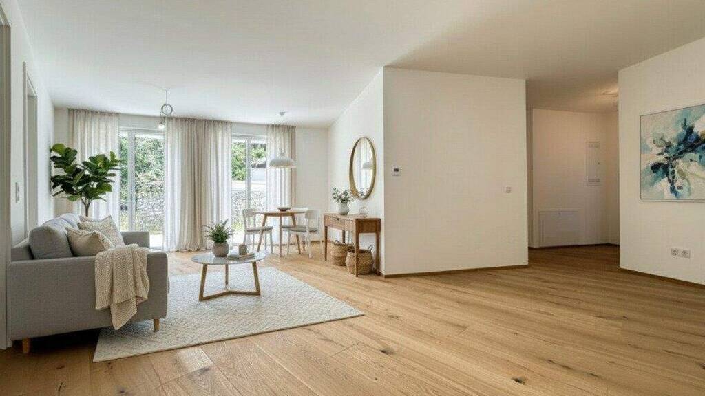 Echtholzparkett & Feinsteinzeug: Eleganter Echtholzparkettboden in den Wohnräumen, stilvolles Feinsteinzeug in den Bädern