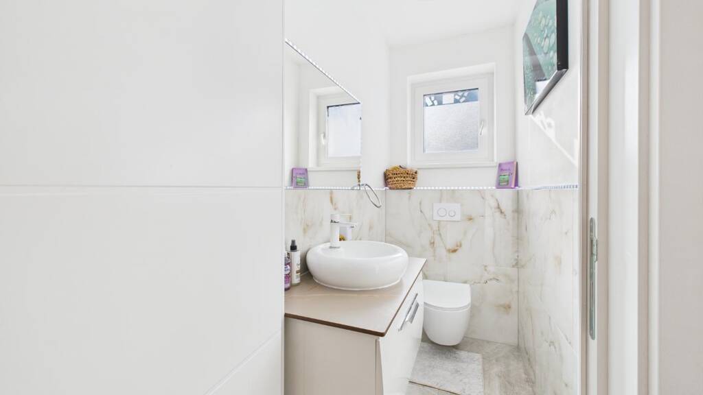 Dieses Zuhause befindet sich auf dem neuesten Stand der Technik und bietet eine Ausstattung, auf dem neuesten Stand der Technik. Beheizt wird das Haus energieeffizient über eine Vaillant Luftwärmepumpe, kombiniert mit Fußbodenheizung, die in allen Räumen für ein angenehmes, gleichmäßiges Raumklima sorgt. Die hochwertigen 3-fach verglasten Fenster - inklusive Insektenschutz (und elektrischen Raffstore im EG, sowie elektrischen Rolläden im OG) - bieten hervorragende Dämmwerte und tragen zu niedrigen Energiekosten bei.