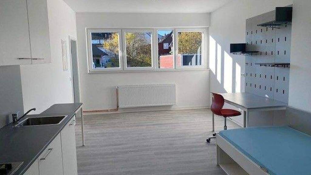Außerdem: - schön hell durch große Fensterfronten - Singleküche mit 2-Platten-Herd, Mikrowelle mit Grillfunktion, Kühlschrank mit Gefrierfach, Spüle, Regal und Unterschränken - weitere Möblierung: Bett, Schreibtisch + Schreibtischstuhl, Kleiderschrank mit Regalen und Spiegel, Garderobe - neuwertiges, modernes Duschbad mit Handtuchhalterheizkörper