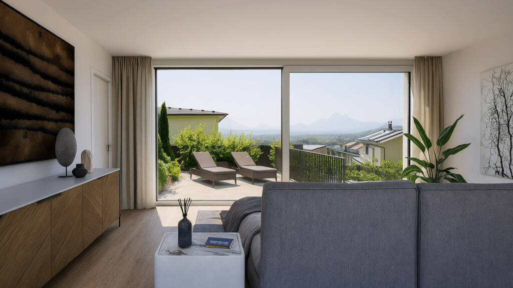 Die Top 1 ist als Garten-Maisonette konzipiert. So gibt es neben einer großen und umlaufenden Terrassenfläche auch noch einen Grünanteil. Die Aufteilung ist funktionell und gut durchdacht. So befinden sich die 3 Schlafzimmer mit 2 Bädern, einem Abstellraum und einer Waschküche im kühlen unteren Bereich, während der offen gestaltete Wohn-Küchen-Essbereich inklusive Garderobe & WC im oberen Teil von einem hellen Ambiente mit viel Tageslicht profitiert. Der Festungsblick ist von den Wohn- und Schlafräumen ebenso wie von der Terrasse und dem privaten Swimmingpool unverbaubar gesichert. Die hochwertige Ausstattung der Wohnung lässt keine Wünsche offen.