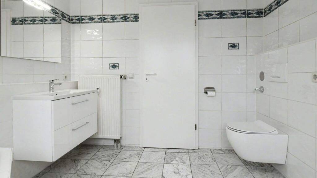 Das Badezimmer präsentiert sich gepflegt und ist mit einer Badewanne sowie einem Waschmaschinenanschluss ausgestattet. Das Schlafzimmer liegt ebenfalls im Dachgeschoss, ist gut proportioniert und erhält durch das Dachfenster ausreichend Tageslicht.
