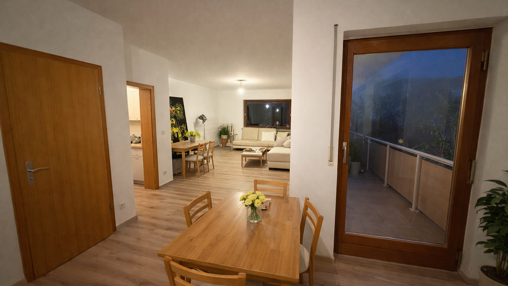 Die Erdgeschosswohnung erstreckt sich über ca. 120 Quadratmeter und zeichnet sich durch eine durchdachte Raumaufteilung aus. Sie umfasst ein einladendes Wohnzimmer mit direktem Zugang zur Terrasse, zwei weitere helle Zimmer, eine praktische Küche sowie ein Badezimmer mit Badewanne, Dusche und WC. Zusätzlich steht ein Gäste-WC zur Verfügung.