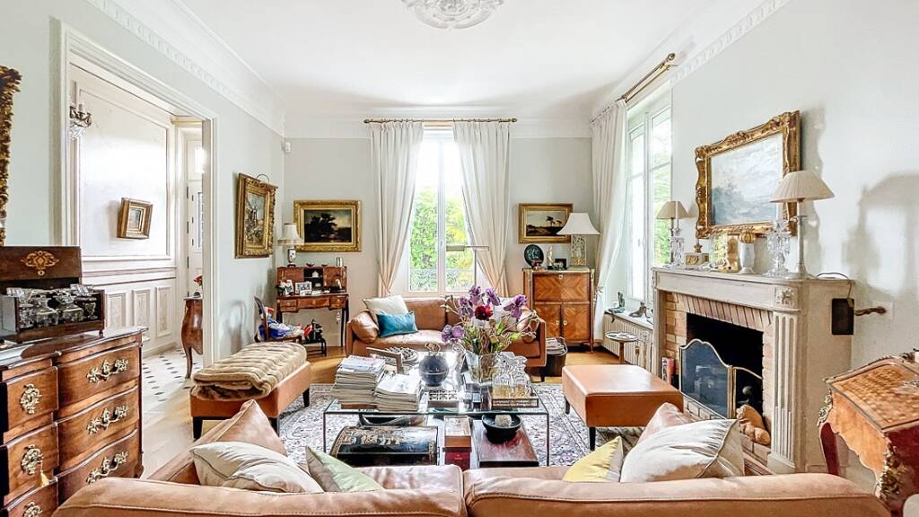 On the first floor, an entrance hall leads to two living rooms that exude elegance and refinement. Numerous windows and high ceilings highlight the warmth and authenticity of the moldings, woodwork, solid parquet flooring and period fireplaces.