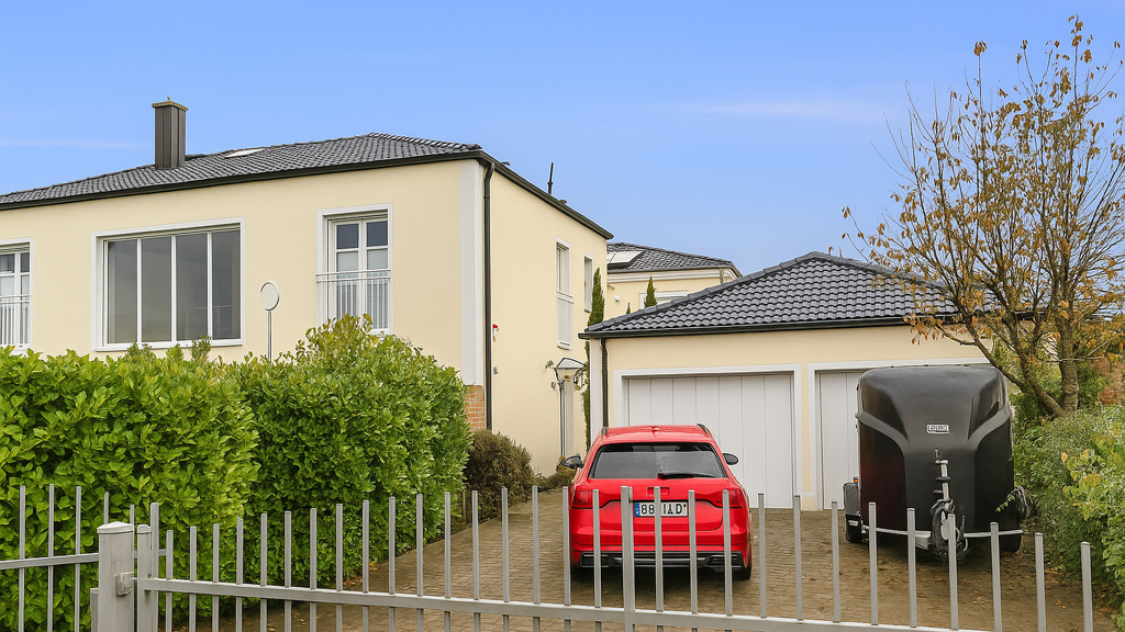 Das großzügige Grundstück mit 667 m² bietet einen liebevoll angelegten Garten, eine große Doppelgarage mit Dachspitz sowie einen separaten Abstellraum für Fahrräder oder Gartengeräte.
