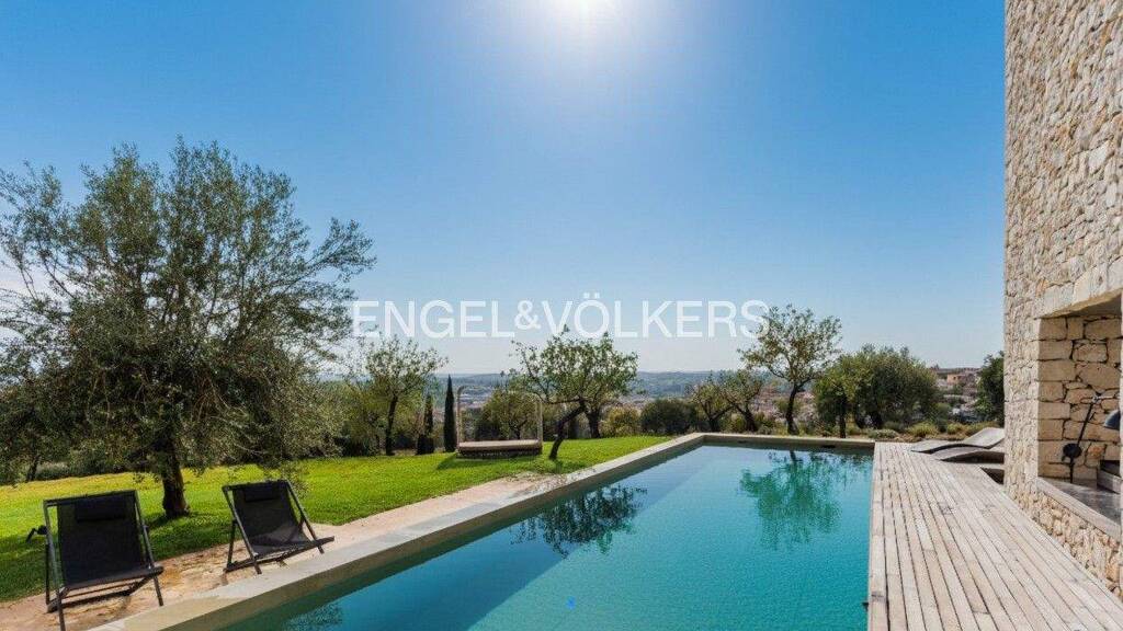 Der Infinity-Pool von 16 × 4 Metern, mit Heizvorrichtung, fügt sich in die Landschaft aus Mandel- und Olivenbäumen ein und schafft einen Entspannungsbereich, der in mehreren Jahreszeiten genutzt werden kann.