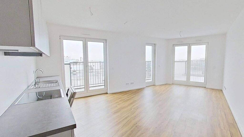 Das Herzstück der Wohnung ist der offene Wohn- und Essbereich am Ende des geräumigen Flures, der durch mehrere bodentiefe Fenster von Tageslicht durchflutet wird. Hier können Sie eine gemütliche Sofa- und Sitzecke gestalten, während die offene Einbauküche mit Kücheninsel und Elektrogeräten zum gemeinsamen Kochen und Verweilen einlädt. Praktische Einbauschränke an einer Wandseite gewähren viel Staumraum. Ein Hauswirtschaftsraum in der Wohnung bietet den Anschluss für Ihre Waschmaschine sowie zusätzliche Abstellfläche für Ihre Haushaltsutensilien.