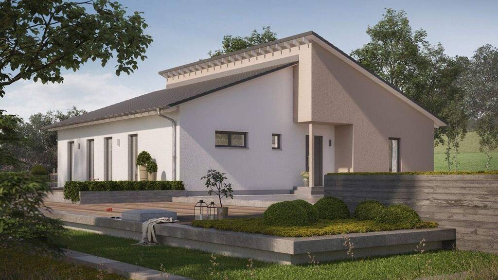 Besonders spannend zeigt sich die Dachform des Bungalows ComfortStyle 14.01 P: Hier entschieden sich die Architekten für die so ungewöhnliche wie attraktive Lösung eines Pultdachs - versetzt angeordnet ergeben sich durch Vor- und Rücksprünge spannende Blickachsen an der Fassade. Der schlichte Baukörper erhält dadurch eine besondere optische Raffinesse, die zugleich auch funktionale Aspekte erfüllt: Es entstehen so ein Wetterschutz für die Hauseingangstür sowie ein geschützter Freisitz. Die Gesamtfläche des ComfortStyle 14.01 P beträgt ca. 143 m² (Nettogrundfläche nach DIN 277) und bietet Wohlfühlwohnen auf einer Ebene. Das dreiseitig belichtete Esszimmer mit der offenen Küche verströmt Atmosphäre und lädt zum Verweilen ein. Zwei Kinderzimmer, ein Arbeitszimmer, das Elternschlafzimmer mit separatem Ankleidezimmer sowie Hauswirtschaftsraum, Gäste-WC und Familienbad sind ansprechend in diesem außergewöhnlichen Bungalow platziert. Windfang, Wohnzimmer und Flur runden das Ensemble ab. Weitere Ausdrucksstärke gewinnt das ComfortStyle 14.01 P im Inneren - besonders bemerkenswert für einen Bungalow - durch den zusätzlichen Freiraum der serienmäßig höheren Wände. Großzügig wohnen, intensiv leben: In diesem in nachhaltiger Bauweise errichteten Bungalow fühlen sich die Bewohner rundum wohl!