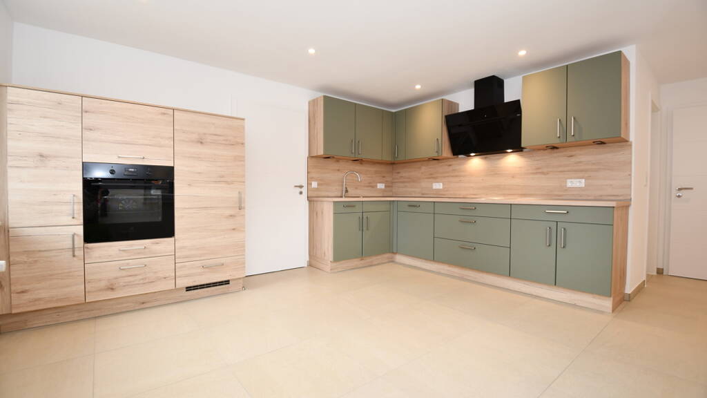 Die großzügige Küche mit einer modernen Einbauküche mit Ceranfeld, Backofen, Spülmaschine und Kühlschrank ist nicht nur funktional, sondern auch ein echter Blickfang - perfekt für alle, die gerne kochen und gemeinsame Zeit verbringen.