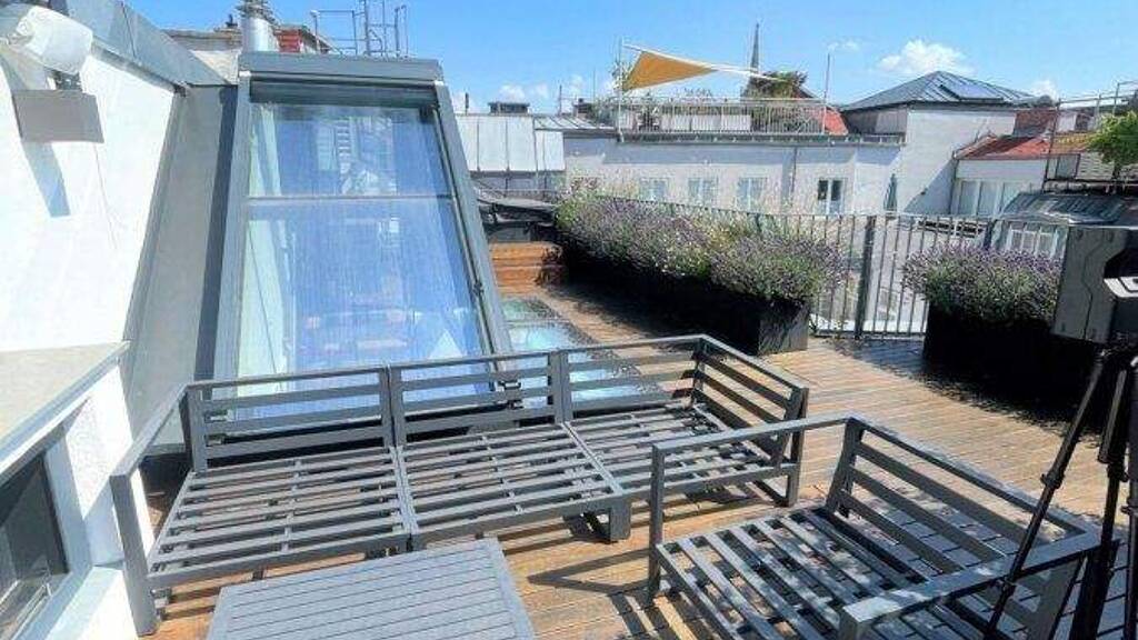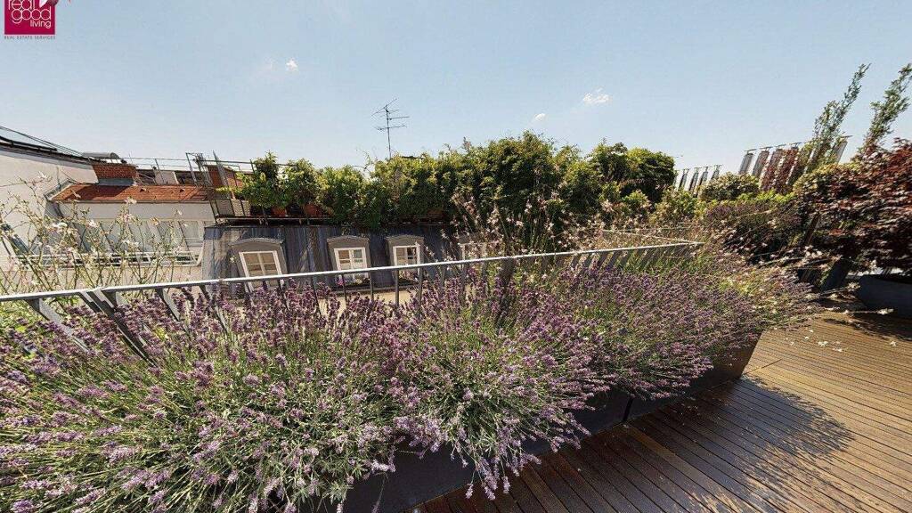 Ein absolutes Highlight ist die rund 65 m² große Dachterrasse, die als privater Rückzugsort über den Dächern Wiens konzipiert wurde. Mit stilvoller Begrünung und einem Whirlpool ausgestattet, eröffnet sie einen spektakulären Blick auf die historische Silhouette der Stadt - mit Blickrichtung zum Stephansdom. Hier entstehen Momente von besonderer Qualität: entspannte Stunden in der Sonne, elegante Abende mit Gästen oder stille Augenblicke über den Dächern der Stadt.