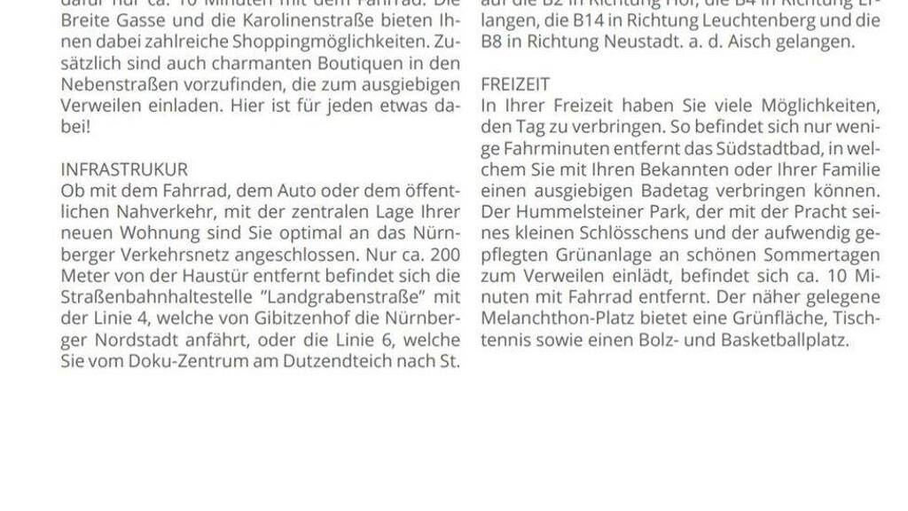 Einkaufsmöglichkeiten (REWE, Aldi, dm, Netto, Norma) sind in wenigen Minuten erreichbar. Die Nürnberger Innenstadt ist mit dem Fahrrad in ca. 10 Minuten erreichbar.