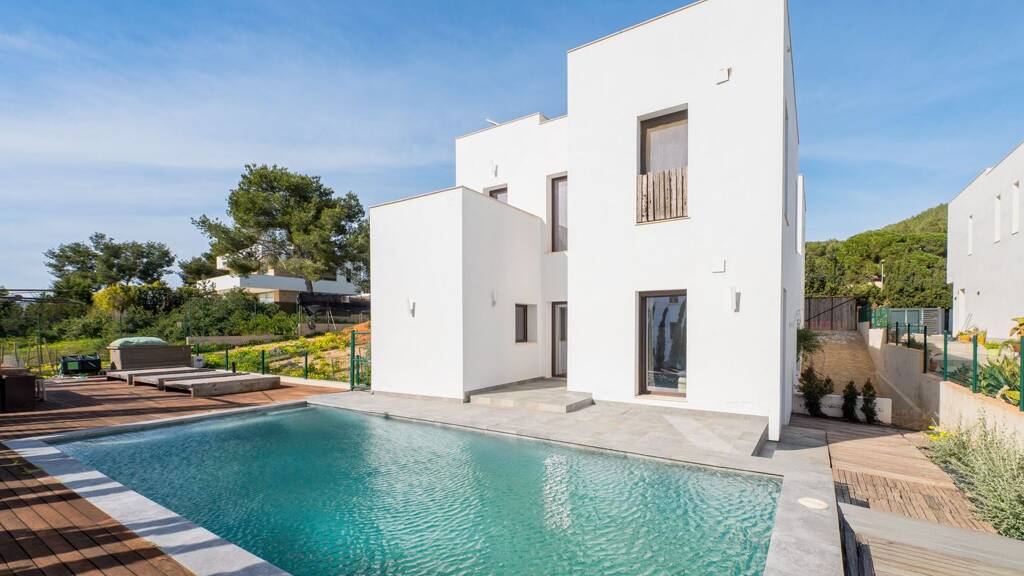 RE/MAX Isla Blanca präsentiert diese elegante moderne Villa in Santa Eulalia del Río, gelegen in einem der begehrtesten Wohngebiete Ibizas. Es wurde 2020 erbaut und bietet 436,61 m² auf einem Grundstück von 604,71 m² und verbindet zeitgenössische Architektur mit Holz und Naturstein, die Wärme und Eleganz bringen.
