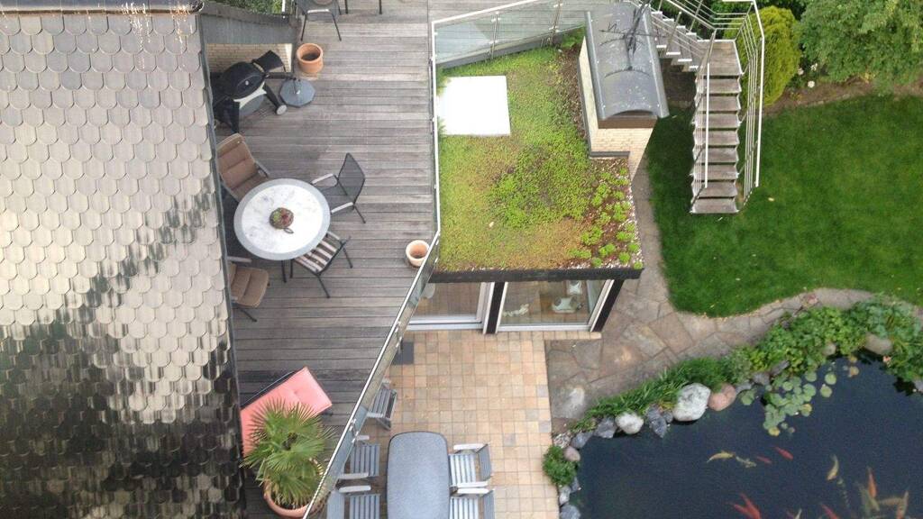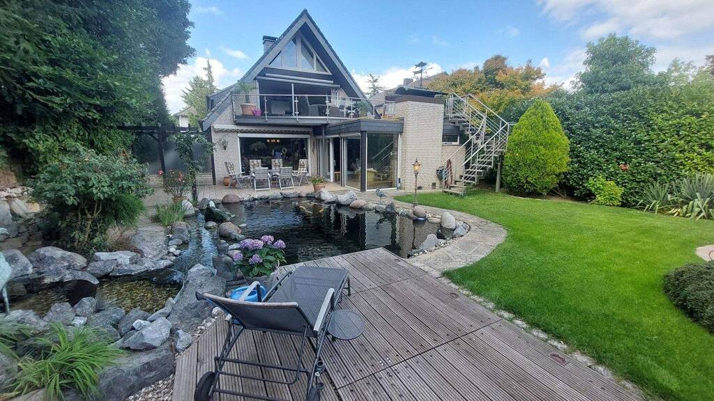 Der liebevoll angelegte Garten ist von beiden Wohneinheiten zugänglich und überzeugt mit einem idyllischen Teich. Der Keller bietet neben praktischem Stauraum auch eine kleine Sauna, die zu entspannenden Stunden nach einem langen Tag einlädt. Ergänzt wird das Angebot durch eine große Garage, die zusätzlichen Komfort und Stellplatz bietet.