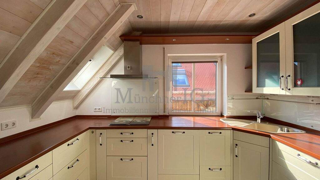 Über das freundliche Treppenhaus erreichen Sie Ihr neues Domizil. Vom Eingangsbereich aus gelangen Sie in den großzügigen Wohn- und Essbereich, der mit bodentiefen Fenstern im Erker sowie einem großen Dachfenster lichtdurchflutet zum Verweilen einlädt. Besonders eindrucksvoll ist die sichtbare Massivholzdecke, denn sie unterstreicht die unterschiedlichen Raumhöhen und vermittelt ein Chalet-Feeling. Darüber hinaus sorgt in den kühlen Monaten der Kamin für Wohlfühlambiente. Zum attraktiven Wohnbereich gehört die separat gelegene Küche. Sie ist mit einer Einbauküche im modernen Landhausstil mit kassettierten Schranktüren und historischen anmutenden Türgriffen ausgestattet. Ein Ceran-Kochfeld, die Dunstabzugshaube, ein Garofen auf Arbeitshöhe, Halogenspots und weiteren Marken-Geräte gehören zur wertigen Ausstattung.