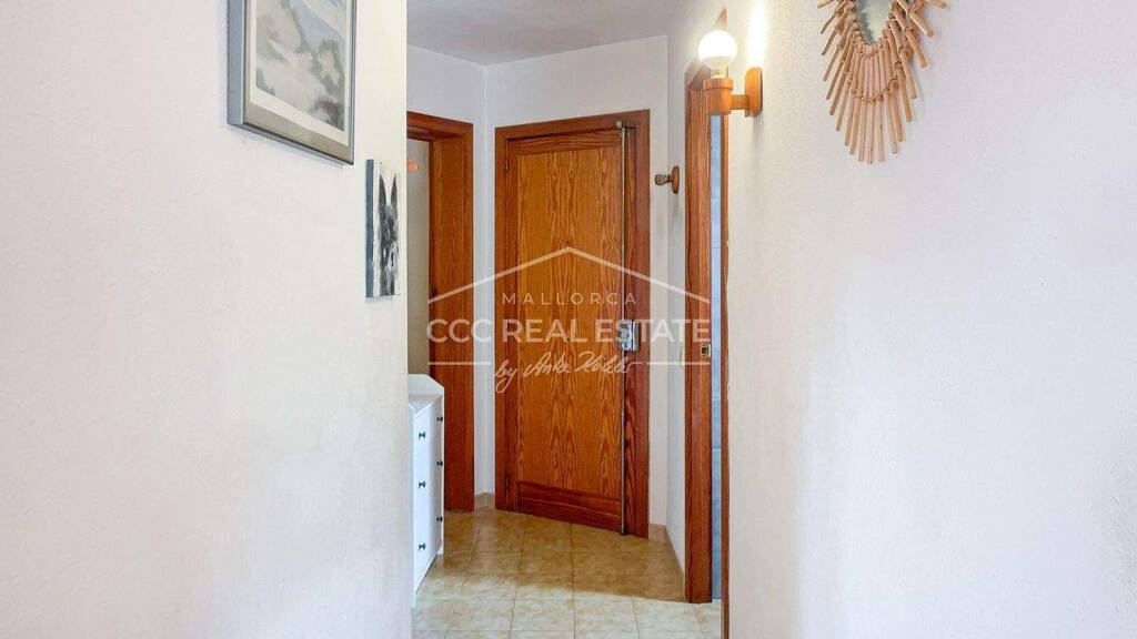 Der Grundriss ist klar strukturiert: Vom Eingangsbereich führt ein Flur zu zwei Doppelschlafzimmern auf der rechten Seite. Links liegt das Badezimmer. Im weiteren Verlauf eröffnet sich der offene Wohn- und Essbereich mit integrierter mallorquinischer Küche. Von hier aus gelangen Sie auf den Balkon, der den Wohnraum um eine angenehme Außenfläche erweitert.