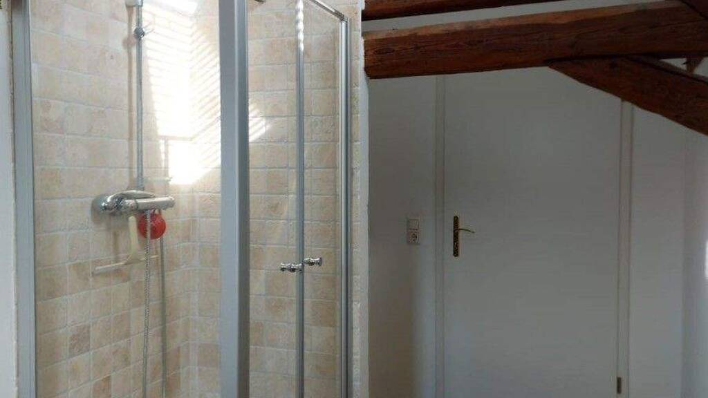 Eine moderne Holztreppe neben dem Regal führt unter das Dach. Das insgesamt ca. 90 m² (Grundfläche) große Dachgeschoss würde sich gut als Wohn-, Arbeits-, Kinder- oder Gästebereich eignen. Auch hier befindet sich noch ein Badezimmer. In diesem Duschbad wurden die Dachbalken ebenfalls offen gehalten.