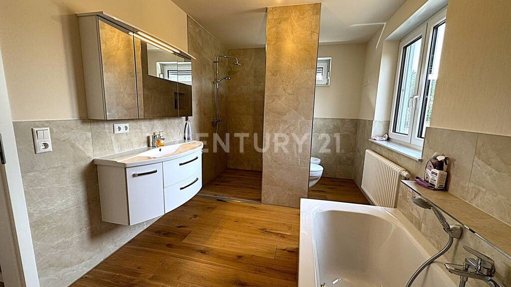 Diese einzigartige Immobilie besticht durch ihre solide Bausubstanz aus Ytong Porenbeton Steinen, die sowohl Energieeffizienz als auch Langlebigkeit gewährleistet. In den 5 geräumigen Zimmern unterstreicht der edle Parkettfußboden das luxuriöse Ambiente. Zwei exquisite Bäder bieten höchsten Komfort und laden zur Entspannung ein. Die Galerie eröffnet einen Blick in den einladenden Eingangsbereich. Wunderschöne große Terrassenfenster und -türen durchfluten die Räume mit natürlichem Licht und verbinden harmonisch Innen- und Außenbereich. Zu den praktischen Highlights gehören zwei Hauswirtschaftsräume, einer für Waschmaschine und Co, sowie einer für die Heizung mit einer modernen Gastherme mit Standspeicher. Ein besonderes Highlight ist die fest installierte Klimaanlage.