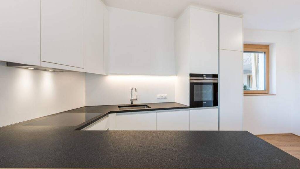 Küche: Tischlerküche mit schwarzer Steinplatte, gebürstet und allen Geräten