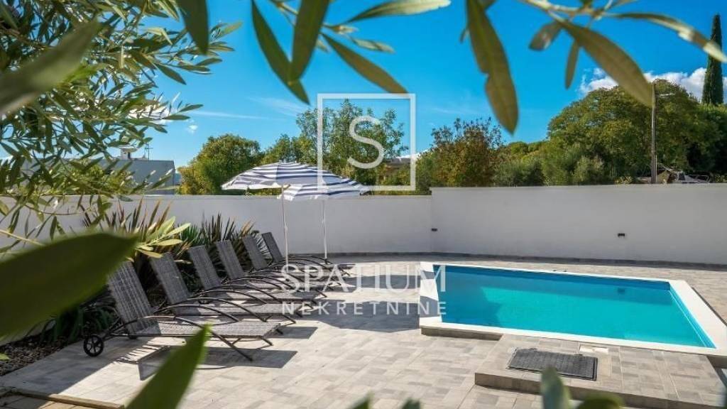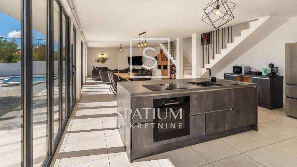 KRK, wir bieten ein freistehendes Haus mit Swimmingpool an. Das moderne zweistöckige Haus mit einer Wohnfläche von 170 m² besteht aus einem Erdgeschoss und einem Obergeschoss, die durch eine doppelte Innentreppe verbunden sind. Erdgeschoss: Küche, Esszimmer und Wohnzimmer mit offenem Konzept, Abstellraum und Gästetoilette. Erster Stock: vier Schlafzimmer mit eigenem Bad und Zugang zu einem gemeinsamen Balkon. Möbliert und voll ausgestattet. Für den Bau wurden hochwertige Materialien verwendet, ausgestattet mit Klimaanlage zum Heizen/Kühlen in allen Zimmern und im Wohnbereich. PVC-Tischlerei, Sicherheitstüren. Innerhalb des eingezäunten und gepflegten Gartens mit einer Fläche von 403 m² gibt es einen Swimmingpool mit Liegewiese, einen Gartenpavillon mit Grill und einen Parkplatz für mehrere Fahrzeuge. Es liegt in einer ruhigen Gegend, umgeben von Grün. Geeignet für einen hochwertigen Urlaub, eine hervorragende Investition in den Tourismus oder einen komfortablen ganzjährigen Aufenthalt.