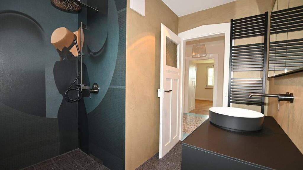 Das Esszimmer geht fließend in den Wohnbereich über und bildet ein harmonisches Raumensemble. Das hochwertig gestaltete Badezimmer überzeugt mit einer großzügigen, bodengleichen und fugenlos ausgeführten Dusche, grafisch abgestimmten Wandoberflächen, schwarzen Designarmaturen, einer Regendusche sowie einem farblich abgestimmten Handtuchheizkörper - ein Wellnessbad mit Hotelcharakter.