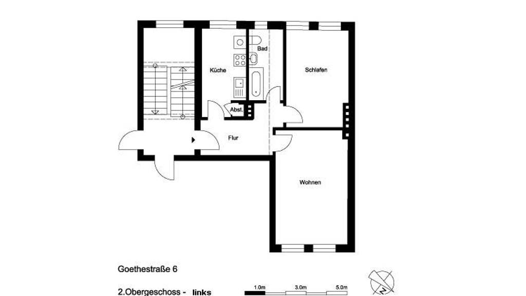 Die Wohnung befindet sich im 2. OG und verfügt über je ein Schlaf- und Wohnzimmer, Küche, Tageslichtbad mit Dusche und Flur. Zur Wohnung gehört ebenfalls ein Kellerraum.