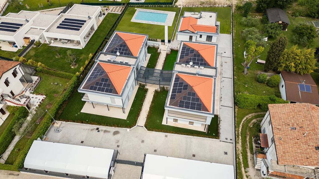 In Lazise bieten wir einen neuen Immobilienkomplex, nur 900 Meter vom historischen Zentrum von Lazise und alle Dienstleistungen bequem zu erreichen ist, zum Verkauf an. Der Bau besteht aus 4 Doppelhaushälften mit jeweils zwei Einheiten. Die Wohnungen im Erdgeschoss bestehen aus einem großen verglasten Wohnbereich mit Zugang zum privaten Garten, einer großen gepflasterten Terrasse, einem Badezimmer mit Fenster und Dusche, einem Schlafzimmer mit Doppelbett und einem zweiten Schlafzimmer. Die Wohnungen im ersten Stock haben die gleiche Innenaufteilung und verfügen über große Terrassen. Die Anlage verfügt außerdem über eine Sonnenterrasse mit einem 60 m² großen Swimmingpool, der sich in einem von den Villen getrennten Bereich befindet, um die Wohnhäuser nicht zu stören. Privater, überdachter Parkplatz und ein Keller pro Einheit.
