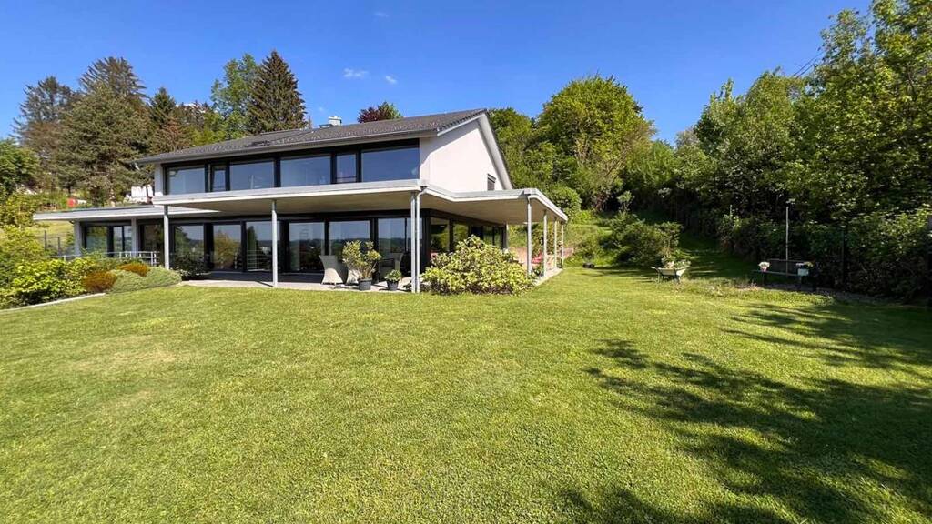 Diese extravagante Villa wurde in Massivbauweise am Hang erbaut und erstreckt sich über drei Etagen. Sie überzeugt mit großzügigem, offenem Wohnraum und praktischen Grundrissen. Alles ist durchdacht und sinnvoll angeordnet. Das Hanggeschoss ist dem Entrée mit Garderobe sowie den Nutzräumen, der Doppelgarage und dem Lagerraum vorbehalten. Von hier erschließen sich die Wohngeschoss über ein teilweise verglastes Treppenhaus mit freitragender Treppe aus Edelstahl und Granit. Im Erdgeschoss ist neben dem 136 m2 großen Bereich Wohnen/Essen/Kochen mit offenem Kamin ein Masterbereich mit Schlafzimmer, Ankleide und großem Bad angeordnet. Die in frischem Blau und Weiß gehaltene Küche ist mit Geräten von Miele ausgerüstet und verfügt über eine praktische Speisekammer. Gästebad und Hauswirtschaftsraum runden diese Ebene ab. Die überdachten Süd- und Westterrassen sind dem Wohnraum vorgelagert und erweitern mit viel Platz für Outdoormöbel den Lebensbereich ins Freie. Der Garten ist ein Paradies für Pflanzenliebhaber und der eigene kleine Wald ist ein herrlicher Abenteuerspielplatz für Kinder. Im Dachgeschoss stehen drei sehr großzügige Wohnräume sowie ein weiteres Bad mit Dusche zur Verfügung. Elektrische Außenjalousien, eine kontrollierte Lüftungsanlage sowie Fußbodenheizung sind obligatorischer Standard.