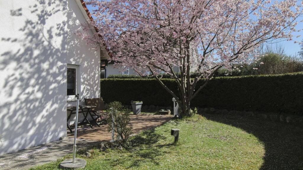 Das ca. 387 m² große Grundstück überzeugt mit einem gepflegten, weitläufigen Garten und lädt zu erholsamen Stunden im Freien ein. Zwei Terrassen - eine vom Schlafzimmer aus zugänglich sowie eine weitere angrenzend an die Küche - erweitern den Wohnraum nach draußen.