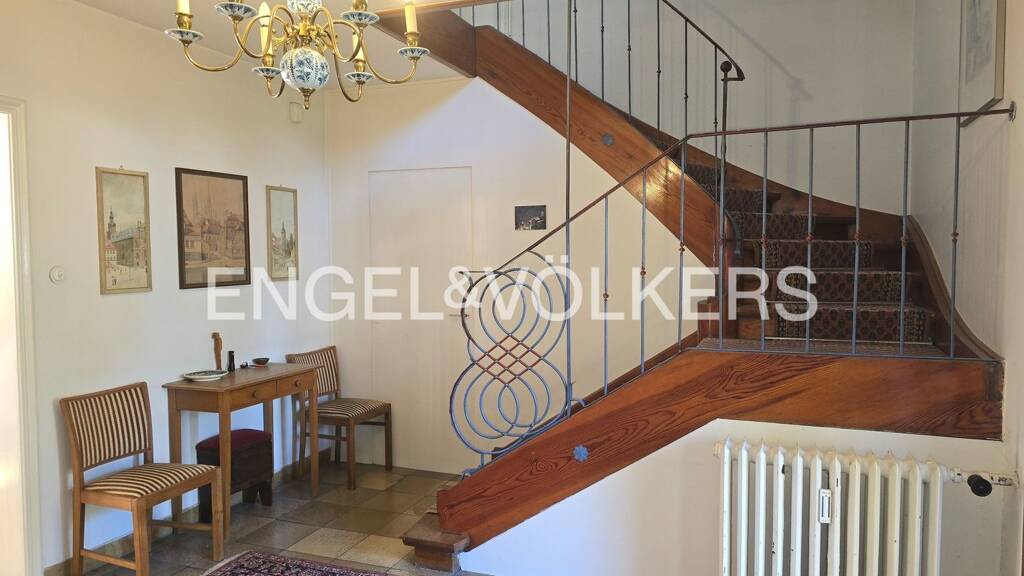 Die Lage ist überzeugend, das Haus eine architektonische Besonderheit, die im Jahr 1964 einen Anbau bekommen hat, der die frühere Erdterrasse ersetzt und dessen Dach nun einen wundervollen Freisitz vor dem Erdgeschoss bildet. Das Bauwerk aus dem Jahr 1936 ist weitgehend im Original erhalten, was eine enorme Ausstrahlung für Liebhaber dieses Baustils bedeutet. Gleichzeitig bedeutet dies auch, dass das Gebäude technische und energetische Verbesserungen gut vertragen könnte. Der Anbau, der einen direkten Gartenzugang und vier Zimmer umfasst, wird ergänzt durch eine kleine Küche, eine Duschmöglichkeit und ein WC. Das Haupthaus, das von Norden betreten wird, und durch den Vorgarten mit Garagenzufahrt und zwei PKW-Stellplätzen sowie einer Grünfläche ausreichend Abstand zur Straße hat, empfängt Bewohner und Besucher mit einem imposanten Foyer, von dem aus das Treppenhaus bis zum Dachgeschoss in seiner vollen Pracht zu sehen ist. Das EG ist geprägt durch drei nebeneinander liegende Räume nach Süden zur wundervollen und teilüberdachten Terrasse, eine Küche mit Terrassenausgang und Kredenz sowie Garderoben- und WC-Bereich. Neben der besonderen Deckenhöhe sorgen die vielen Fenster für eine freundliche Atmosphäre. Das erste OG hat drei Zimmer nach Süden, die durch den großen, vorgelagerten Balkon innen und außen perfekte Voraussetzungen für Mußestunden bieten. Ein Badezimmer mit Wanne, Dusche und zwei Waschbecken, ein separates WC und ein vierter Raum, der über Küchenanschlüsse verfügt, runden die Ebene ab. Das Treppenpodest verbindet all diese Flächen miteinander und ist eine schöne Spielfläche für Kinder oder Hobbys. Das DG ist teilausgebaut. Zwei der Räume sind als Bühne zu betrachten, von einem gelangt man eine Ebene höher zum Lagerraum im Dachspitz. Hier bestünde die Möglichkeit, mehr Flächen zu entwickeln. Ein sehr großes Studiozimmer nach Osten und zwei ausgebaute Zimmer nach Westen sind sofort verfügbar. Im UG verfügt das Haupthaus über Kellerräume zur Lagerung von Speisen und Hausrat, einen Heizraum mit Gaszentralheizung und eine Waschküche. Wasser wird dezentral erwärmt, es gibt hierfür Boiler oder Gasthermen. Die letzte umfassende Modernisierung fand mit dem Anbau statt, daher sollten Interessenten von Sanierungskosten von mind. 500.000 €, eher mehr, ausgehen und den Beratungsempfehlungen des GEG folgen, um technisch besser zu werden, ohne dem Haus seinen Charme zu nehmen. Wir freuen uns auf Liebhaber dieses Baustils und der Lage und unterstützen Ihre Objektprüfung sehr gerne.