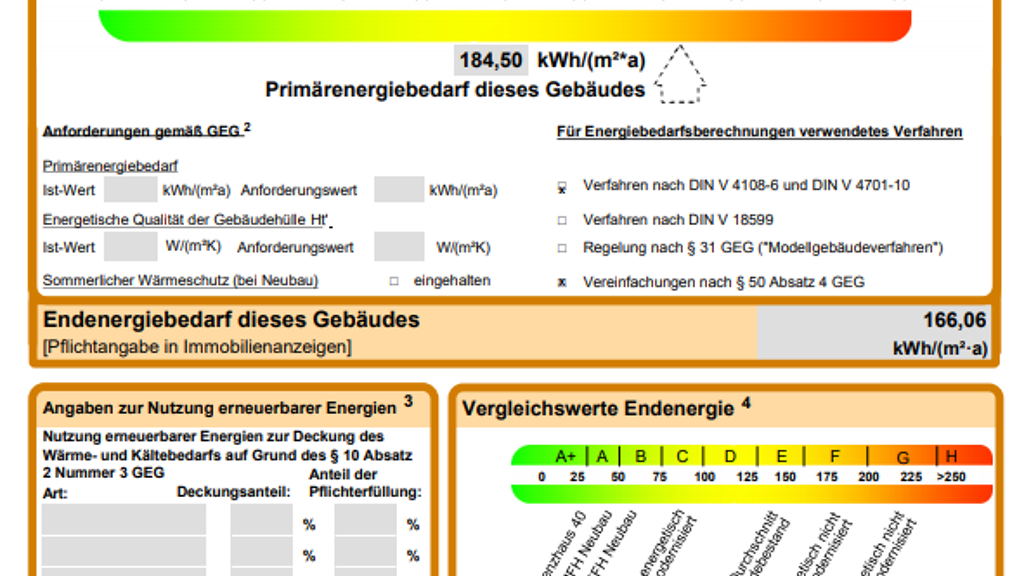 Der Energiekennwert ist 166,06 (kWh m²a*) wesentlicher Energieträger Öl. Die Wohnung wird über Radiatoren und teilweise mit einer Fußbodenheizung beheizt.