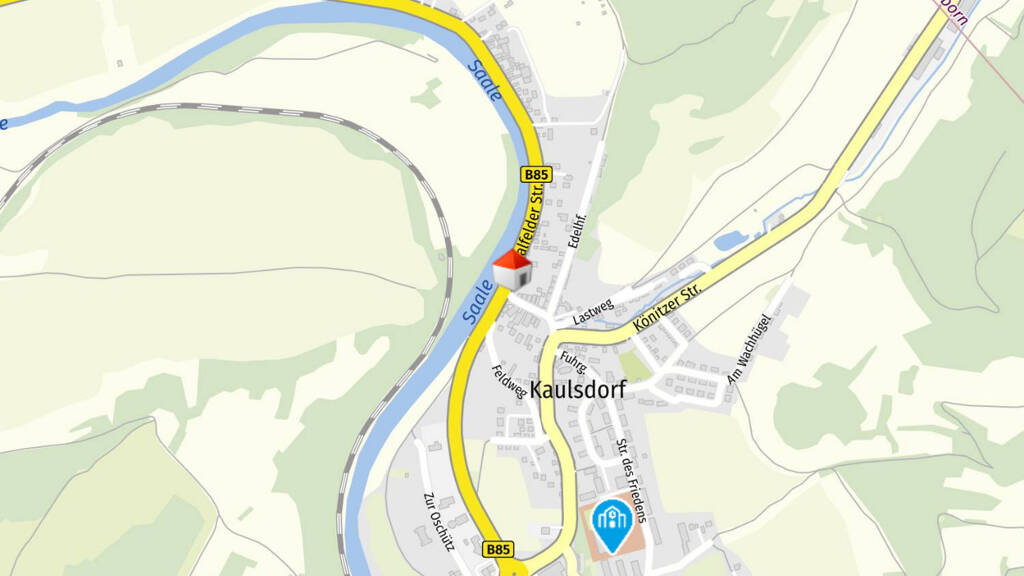 Das charmante Einfamilienhaus befindet sich in der idyllischen Saalfelder Straße in Kaulsdorf, einem malerischen Ort in Thüringen, Deutschland. Kaulsdorf ist bekannt für seine ruhige und naturnahe Umgebung, die einladend für Familien und Naturliebhaber gleichermaßen ist.