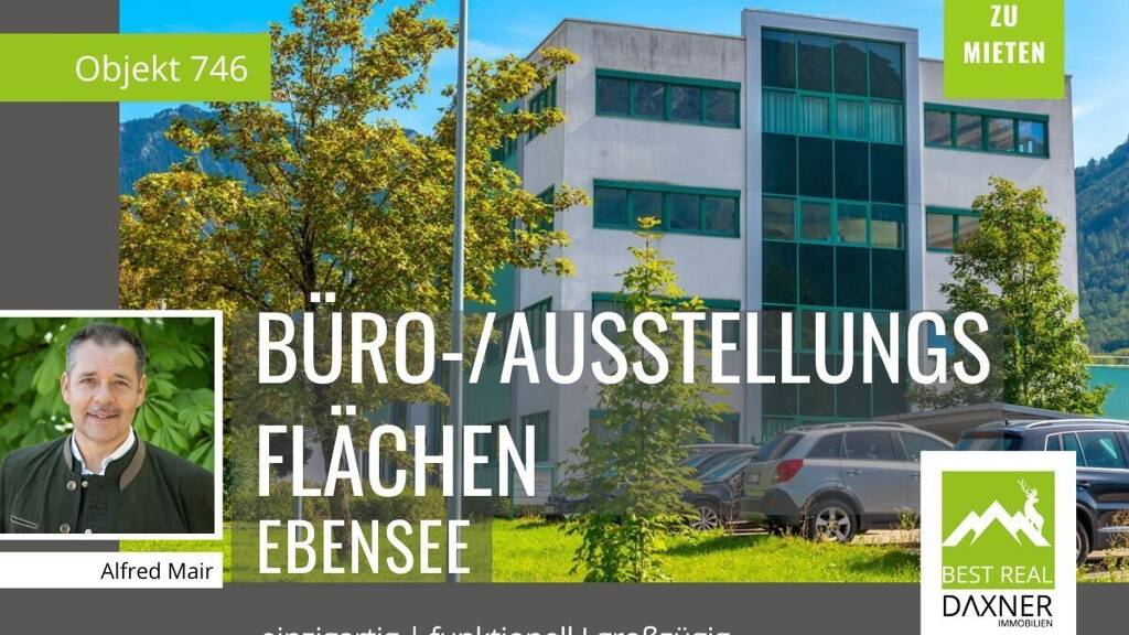 Im Industriegebiet "Steinkogel" in Ebensee Richtung Bad Ischl liegend, wurde hier 1993 ein modernes Verwaltungsgebäude mit 4 Etagen mit jeweils 615m² Nutzfläche errichtet. Zur Vermietung stehen die beiden oberen Etagen (2. und 3. OG) mit einer Gesamtfläche von 1.230 m² zur Verfügung. Im 2. Obergeschoß befindet sich derzeit neben den 4 Toilettenanlagen eine große Ausstellungsfläche welche vom Mieter an seine Bedürfnisse angepasst werden kann. Im 3. Obergeschoß verfügen Sie über 15 Büroräume, Teeküche, Empfangsbereich, 4 Toilettenanlagen und div. Nebenräume. Ein Lift im großzügig gestalteten Zugangsbereich ist obligatorisch.