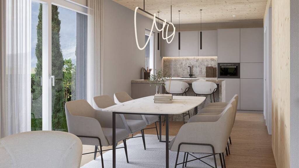 Beim Betreten der Haushälfte empfängt Sie ein großzügiger Vorraum für Garderobe und Stauraum. Weiter gehts zum Herzstück: Dem großen Wohn- & Esszimmer, dank Südausrichtung und großen Fensterflächen sehr hell. Hier finden eine Küche mit angrenzender Speis, ein großer Esstisch und eine gemütliche Wohnarea ihren Platz. Ein Gäste-WC ergänzt das Raumangebot im Erdgeschoss. Ein stilvolles Detail, welches sich durchs ganze Haus zieht: Echtholzwand im Essbereich und eine edle Massivholzdecke. Vom Wohnbereich führt eine Treppe hinunter in den Keller und hinauf in die private Etage.