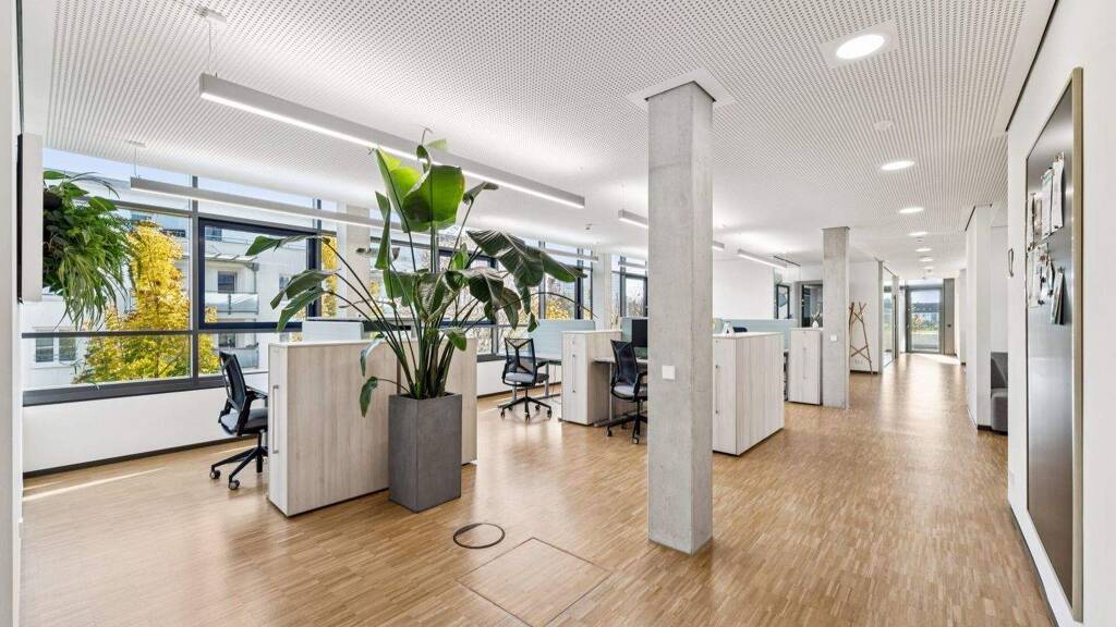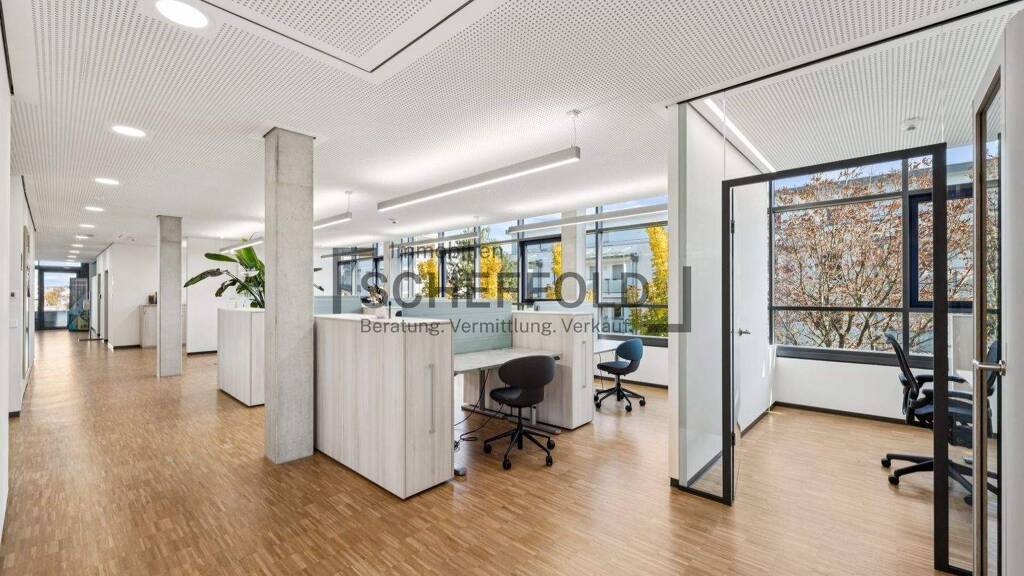 Lassen Sie sich von den großzügigen Fensterflächen begeistern, die die Räume mit natürlichem Licht durchfluten und für eine helle, freundliche Arbeitsatmosphäre sorgen. Sie unterstreichen das offene Raumgefühl der gesamten Etage und schaffen ein Umfeld, in dem sich Mitarbeiter und Besucher gleichermaßen wohlfühlen.