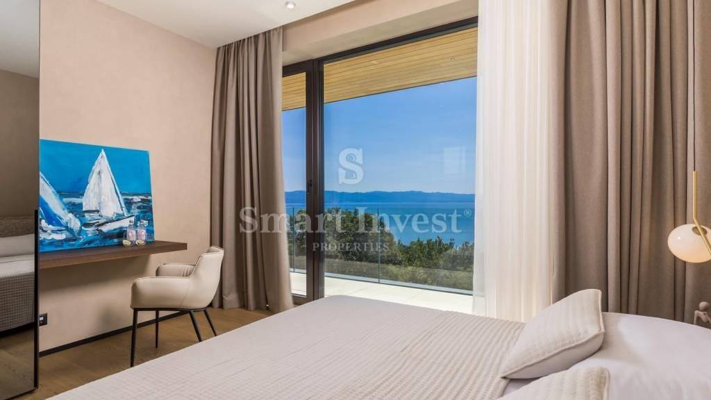 Im Erdgeschoss finden Sie ein luxuriöses offenes Wohnzimmer mit Küche und Esszimmer, das sich zu einer geräumigen Terrasse mit Swimmingpool und bezauberndem Meerblick erstreckt. Große Glaswände über die gesamte Länge des Wohnzimmers und der Küche sorgen für viel natürliches Licht und einen ungehinderten Blick auf das Blau der Kvarner Bucht. Auf dieser Ebene befinden sich außerdem ein geräumiger Kleiderschrank, eine Toilette, ein Zimmer und eine zusätzliche Außentoilette.