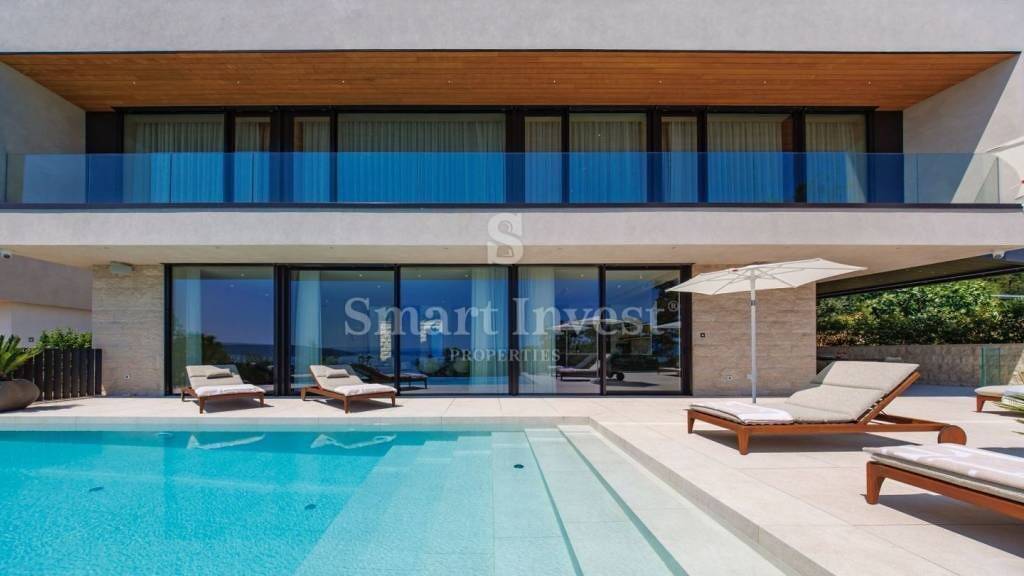Im ersten Stock befindet sich ein Flur mit Zugang zu drei luxuriösen Schlafzimmern, jedes mit eigenem Bad und Zugang zu einer gemeinsamen Loggia mit Blick auf das Meer. Darüber hinaus umfasst die Etage ein Arbeitszimmer und einen Hauswirtschaftsraum, was volle Funktionalität gewährleistet.