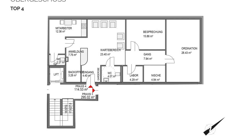 Die Raumaufteilung der Fläche umfasst insgesamt 4 Zimmer, die flexibel als Büro- oder Behandlungsräume genutzt werden können. Durch die modernen Sanitäranlagen und die barrierefreie Gestaltung ist diese Praxisfläche auch für Personen mit eingeschränkter Mobilität geeignet.