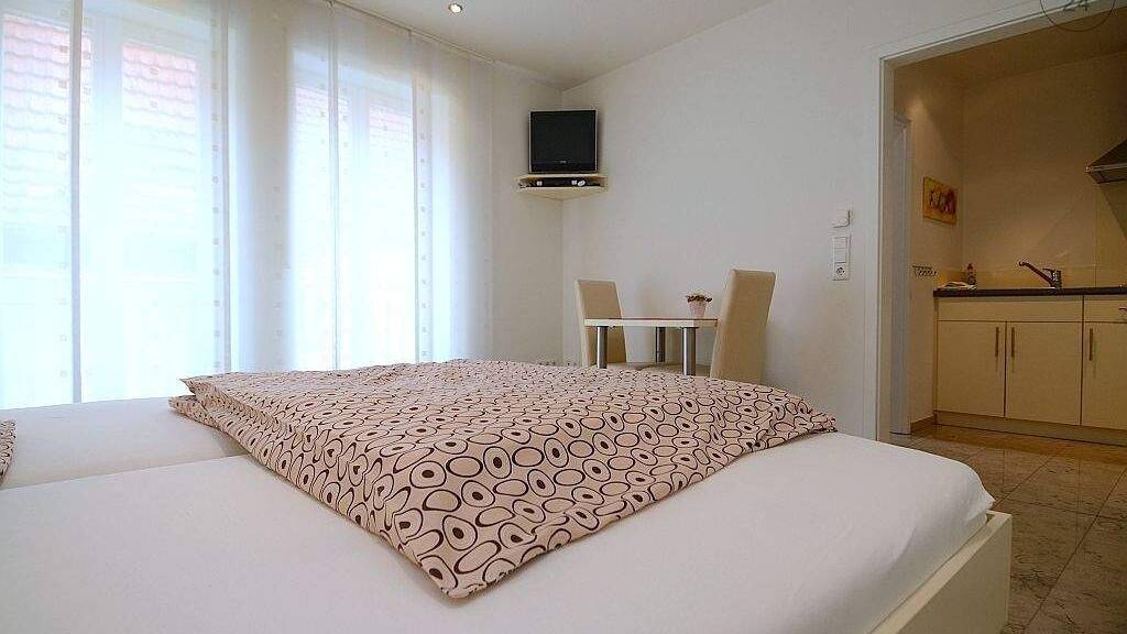 Die ca. 24m² große Wohnung, welche mit Fliesenboden ausgelegt und durch Fußbodenheizung erwärmt wird, befindet sich auf der 1. Etage eines Mehrfamilienhaus. Der Wohn- und Schlafbereich ist mit einem Doppelbett mit Nachttischen, Schrank, Flachbild-TV und einem Esstisch für zwei Personen eingerichtet. Angrenzend befindet sich die Einbauküche, welche mit zwei Herdplatten und einer Kaffeemaschine ausgestattet ist. Das hell geflieste Tageslichtbad verfügt über eine Dusche und ein WC. In der angegebenen Miete ist eine Betriebskostenpauschale von 150€ inkludiert. Wlan ist bereits im Mietpreis enthalten. Die Wohnung muss regelmäßig gereinigt werden. Das kann nach Absprache auch gerne die Vermieterin übernehmen, Kosten hierfür sind ebenfalls nach Absprache. Bei Auszug wird eine Endreinigung je nach Aufwand mit der Kaution verrechnet. Randersacker ist in ca. 10 Minuten von Würzburg entfernt.