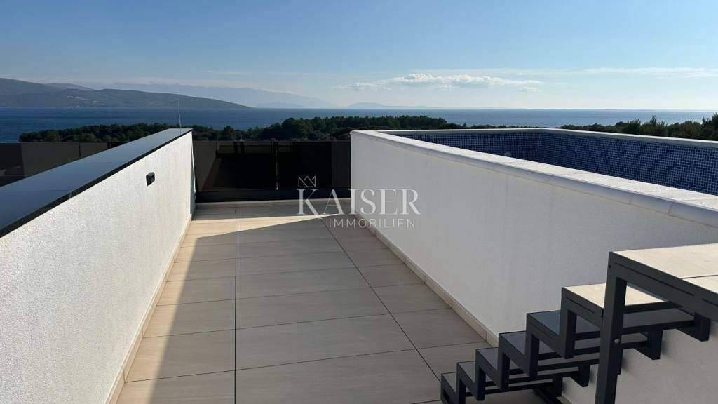 Kaiser Immobilien vermittelt den Verkauf eines luxuriösen, zweistöckigen Penthouse-Apartments in Krk, nur 400 m vom Meer und 600 m vom Stadtzentrum mit allen wichtigen Annehmlichkeiten entfernt. Das Apartment erstreckt sich über das erste und zweite Obergeschoss eines zweistöckigen Stadthauses und bietet eine Wohnfläche von insgesamt 167 m². Im ersten Obergeschoss befinden sich zwei Schlafzimmer, ein Badezimmer und ein Hauptschlafzimmer mit eigenem Bad. Alle drei Schlafzimmer haben Zugang zu einer 29 m² großen, überdachten Terrasse mit Panoramablick auf das Meer und die Stadt Krk. Im zweiten Obergeschoss befindet sich ein offener Wohnbereich mit Wohnzimmer, Küche, Essbereich und Gäste-WC. Vom Wohnzimmer gelangt man auf eine großzügige, 42 m² große, überdachte Terrasse mit atemberaubendem Blick auf das Meer, die vorgelagerten Inseln und die mittelalterliche Stadt Krk. Die Bruttogeschossfläche des Apartments beträgt 270 m². In Kombination mit der optimalen Raumaufteilung ist dieses Penthouse äußerst geräumig und eignet sich hervorragend sowohl für ganzjähriges Wohnen als auch für die gelegentliche Nutzung. Ein besonderes Highlight dieser Immobilie ist die 75 m² große Dachterrasse mit Pool und Liegewiese - der ideale Ort, um Sonnenuntergänge und Sommerabende am Mittelmeer zu genießen. Für Bau und Ausstattung wurden hochwertige Materialien verwendet. Die Wohnung verfügt über Fußbodenheizung mit Wärmepumpe, Klimaanlage in allen Räumen, hochwertige Keramikfliesen und ausgestattete Badezimmer, Parkettböden und Treppenhäuser sowie massive Aluminiumfenster und -türen in Kombination mit elektrischen Rollläden und Sicherheitstüren. Zur Wohnung gehören außerdem zwei Parkplätze in einem angelegten Garten. ID-Code: 107-10. Die Maklerprovision für den Käufer beträgt 3 % zzgl. MwSt. und wird beim Kauf der Immobilie mit Abschluss des ersten Rechtsakts fällig.