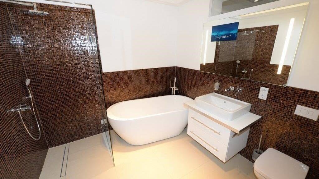 Badezimmer: Besonderes Augenmerk verdient das modern designte Bad mit wunderschönen Mosaikfliesen im Nassbereich sowie großformatigen Bodenfliesen. Es verfügt über eine Badewanne und eine bodentiefe Dusche. Über dem modernen aufgesetzten Waschtisch mit Unterbauschrank ist bereits ein beleuchteter Spiegel integriert, von der Decke strahlen Downlights sowie eine indirekte LED-Beleuchtung. Alles in allem wurde ein Badezimmer geschaffen, in dem Sie sich durch und durch wohlfühlen werden. Highlight ist der im Spiegel integrierte LCD-TV. Beim Baden einen guten Film schauen? Kein Problem.
