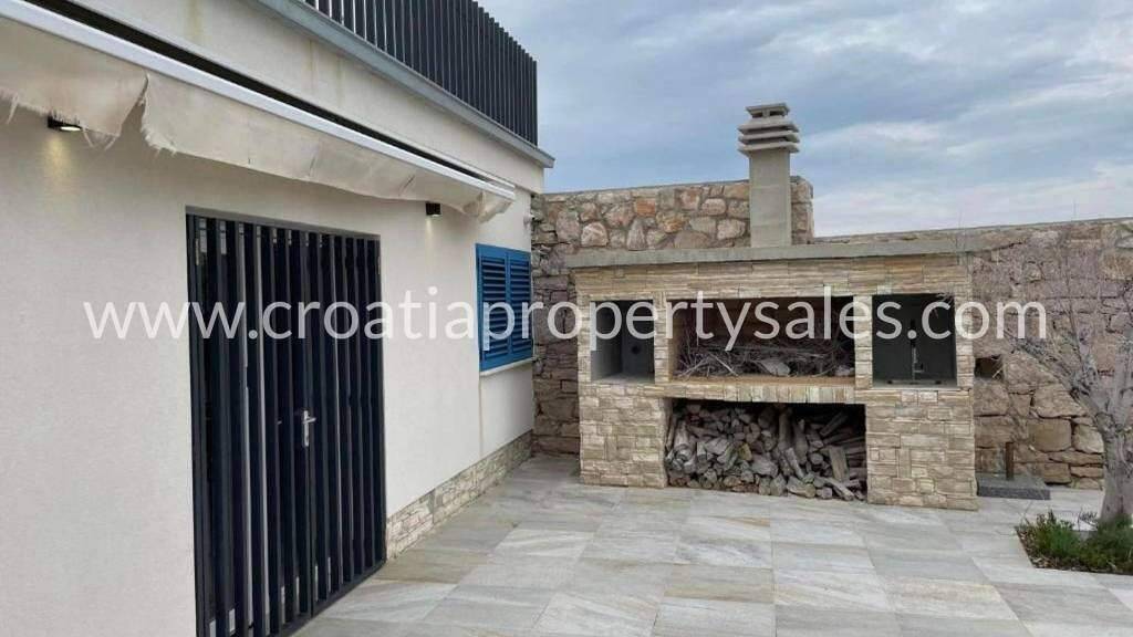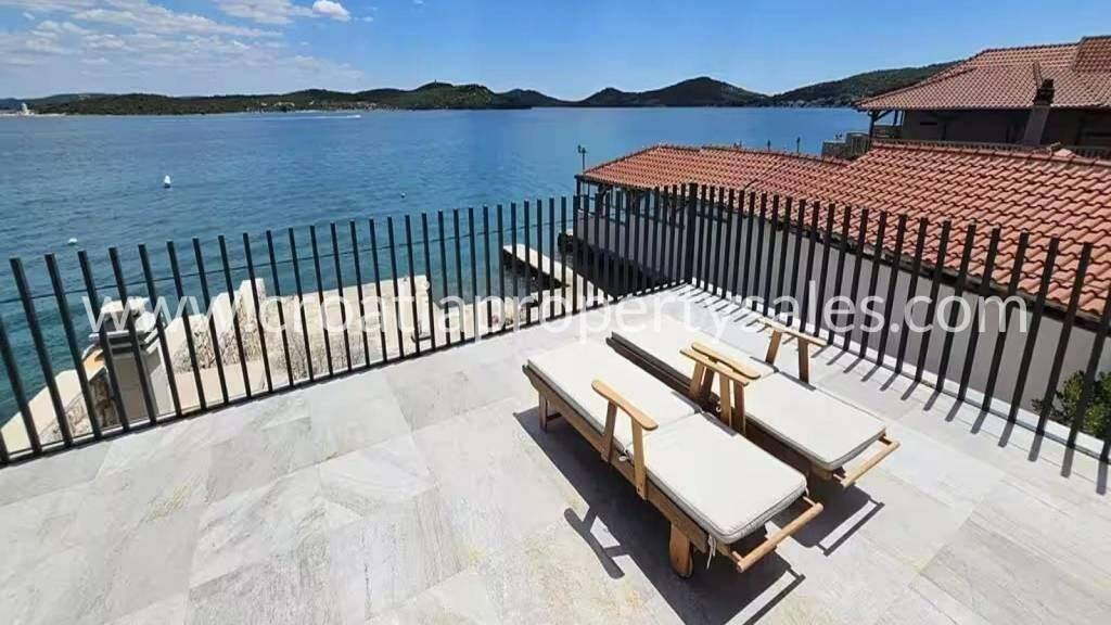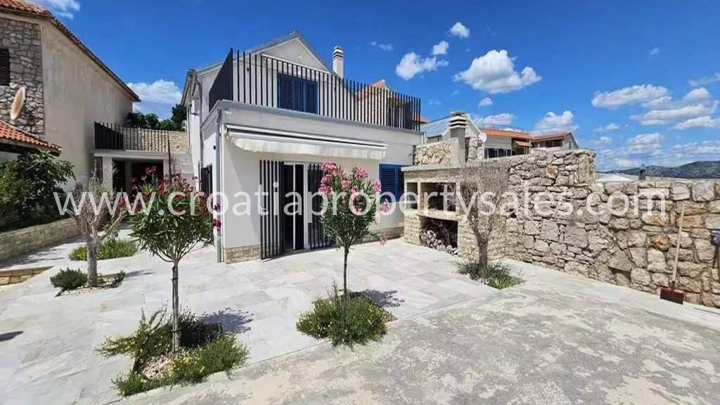 Einzigartiges Haus in erster Reihe zum Meer auf der Insel Betina. Private Terrasse mit direktem Zugang zum Meer und der Möglichkeit zum Anlegen eines Bootes. Das Haus besteht aus zwei separaten Apartments mit je 100 m2. WOHNUNG IM ERDGESCHOSS:Die Erdgeschosswohnung bietet direkten Zugang zum Meer.Sie verfügt über eine moderne Küche, ein gemütliches Wohnzimmer und zwei geräumige Schlafzimmer.Außerdem gibt es ein Badezimmer und ein separates WC.Große private Terrasse direkt am Meer mit Panoramablick; ein ruhiger Ort zum Entspannen und Sonnenbaden.Im Erdgeschoss befindet sich eine voll ausgestattete Sommerküche mit Grillplatz direkt am Meer. WOHNUNG IM ERSTEN STOCK:Sie besteht aus einer voll ausgestatteten Küche und einem gemütlichen Wohnzimmer mit viel Platz zum Entspannen und Beisammensein.Es gibt zwei große Schlafzimmer, ideal für Erwachsene, und ein zusätzliches kleineres Zimmer, ideal für Kinder oder als Arbeitszimmer.Das Apartment verfügt über ein separates Badezimmer und ein separates WC. Ein besonderer Vorteil dieser Wohnung ist die große, 20 m2 große Terrasse mit herrlichem Panoramablick aufs Meer der perfekte Ort zum Entspannen ohne Ablenkung. Direkt am Meer gelegen, ohne Straße zwischen Haus und Strand. Ruhige Fußgängerzone Zufahrt mit dem Auto bis ca. 100 m, Parkplatz inklusive.7 Gehminuten zum nächsten Strand und Café. Ideal für Familien, Urlauber oder zur Ferienvermietung.