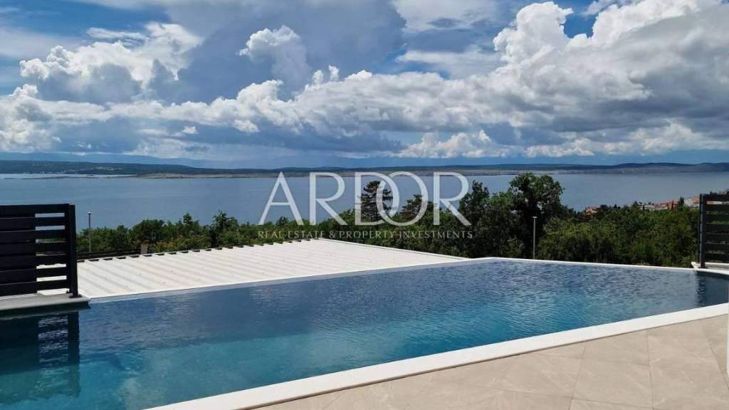 Crikvenica, Luxushaus zu vermieten mit Panoramablick auf das Meer und Swimmingpool. Das Haus ist neu gebaut, modern und mit hochwertigen Möbeln ausgestattet. Im Erdgeschoss gibt es eine Toilette und einen offenen Bereich mit Küche, Esszimmer und Wohnzimmer, von dem aus man durch eine Glaswand auf die Terrasse und den Liegebereich mit Swimmingpool gelangt. Im Zwischengeschoss befindet sich ein Zimmer mit eigenem Bad und im ersten Stock befinden sich drei Schlafzimmer mit eigenem Bad und einer Terrasse mit Blick auf das Meer. Das Gebäude verfügt über eine weitere Zwischenetage, in der sich ein Zimmer mit Bad und ein kleiner Balkon befinden. Die Warmwasserbereitung erfolgt über Sonnenkollektoren, die Beheizung des Gebäudes erfolgt über eine Fußbodenheizung. Das Gebäude verfügt über eine Garage mit zwei Stellplätzen.
