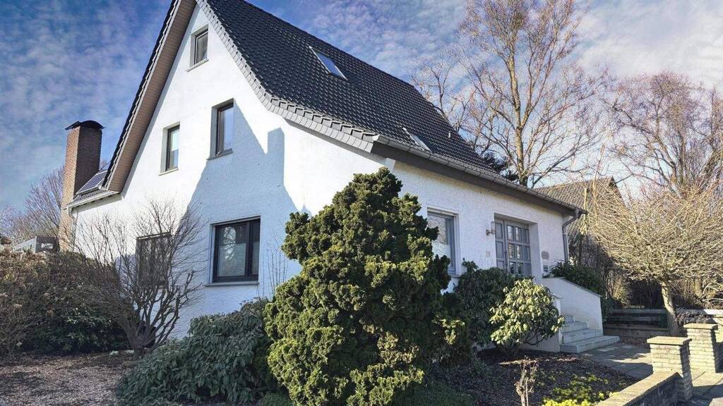 Dieses großzügige Wohnhaus in Bünde-Dünne ist ideal für Familien, die nach einem geräumigen und modernen Zuhause mit schönem Garten suchen. Die Immobilie wurde bislang als 2-Familienhaus genutzt und bietet jeweils eine Wohnung im Erd- und Dachgeschoss. Eine Nutzung als großzügiges 1-FH ist ebenfalls möglich. Das Erdgeschoss teilt sich auf in einen ansprechend gestalteten, weitläufigen Wohn-/Essbereich mit Wintergarten, Innen- und Außenkamin, zwei Schlafräume, Küche, Büro und Bad. Die Dachgeschosswohnung verfügt über einen ebenfalls geräumigen Wohn-/Essbereich mit Zugang zum West-Balkon, Schlafraum, Küche und Bad.