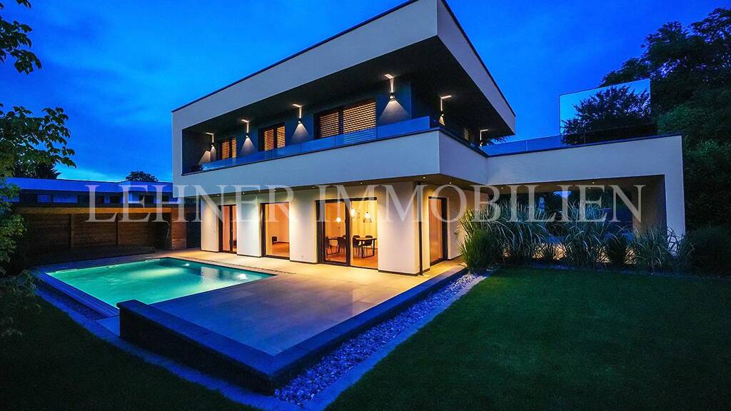 Eckdaten: Wohnfläche 176 m², Grundfläche 630 m², 5 Zimmer, 2 Bäder, Abstellraum 11 m², Südwest-Terrasse im Erdgeschoss 30 m², Südwest-Terrasse im Obergeschoss 57 m², hochwertige Küche mit Naturstein-Arbeitsplatte, Miele-Küchengeräte, BORA-Dunstabzug, Weinkühlschrank, hochwertige Badezimmermöbel, stilvoller Garderobenverbau, Doppelcarport, Luftwärmepumpe mit Fußbodenheizung, Bauweise: 25er-Ziegel plus 16 cm Wärmedämmung, Raumhöhe 2,80 m, wand- und flächenbündige Innentüren, flächenbündige Sockelleisten, Eiche-Parkettboden, Feinsteinzeug-Fliesen, Kunststoff-Alu-Fenster mit Dreifachverglasung, elektrische Raffstores, Insektenschutz, Enthärtungsanlage, KNX-Smart-Home-System, Salzwasserpool 8 × 4 m, Poolheizung, Poolüberdachung, Poolroboter, Rasenroboter, automatische Hecken- und Gartenbewässerungsanlage. HWB 41 kWh/m²a, fGEE 0,67.
