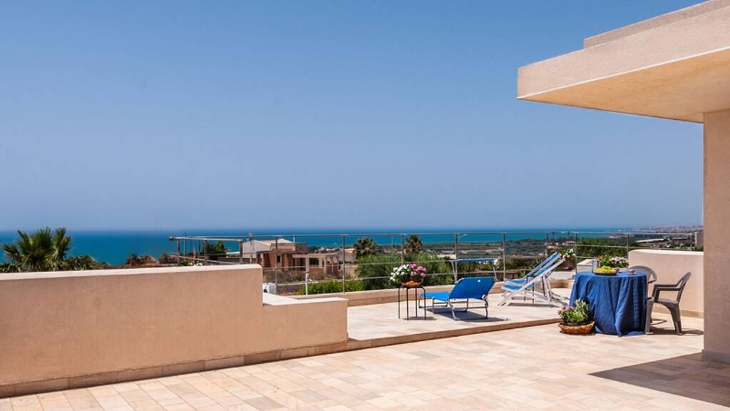Schöne Terrassen von etwa 130 Quadratmetern laden zum Verweilen ein und bieten einen spektakulären Blick auf den Sonnenuntergang, auf das Naturschutzgebiet des Flusses Irminio bis zur gesamten Küste von Donnalucata und Marina di Ragusa.