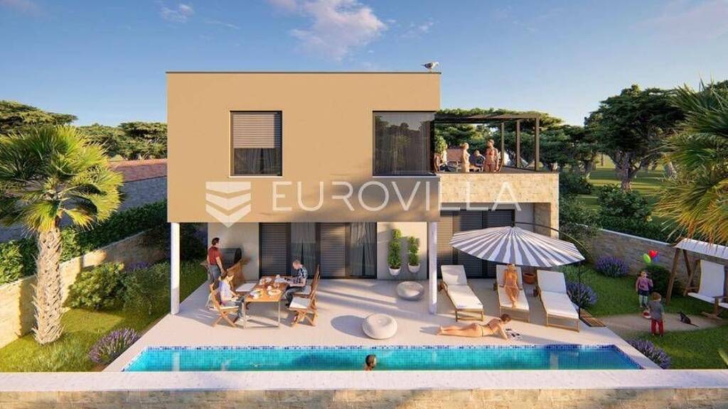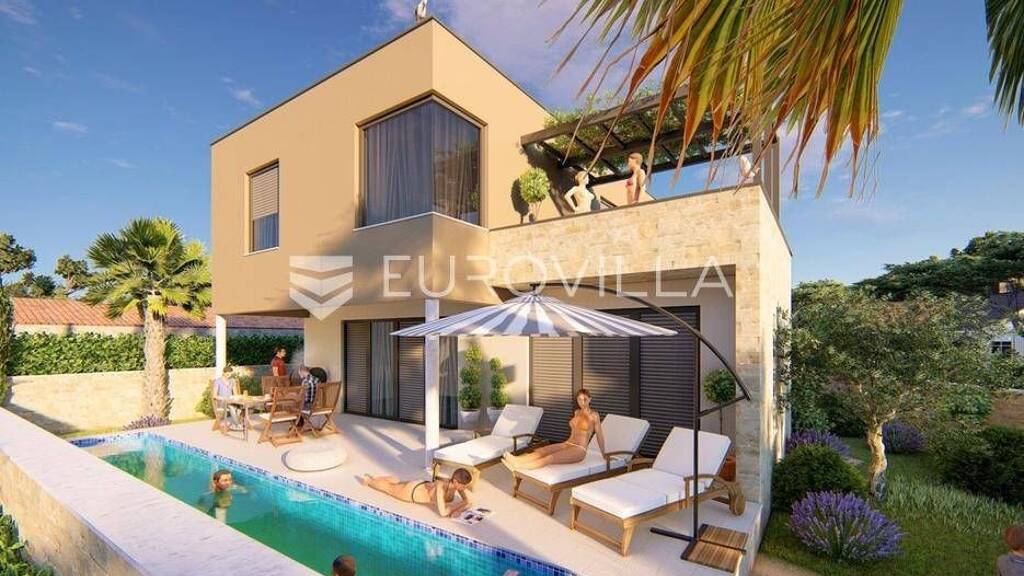 Nudimo Vam arhitektonski predivnu vilu s bazenom koja se gradi najkvalitetnijim materijalima kao i najsuvremenijom opremom.Nekretnina se proteze na dvije etaze, pocevsi od prizemlja gdje se smjestio dnevni boravak s kuhinjom i blagovaonicom, dvije spavace sobe, kupaonica i ostava. Zatim se vanjskim stepenicama penjemo na kat istog rasporeda s natkrivenom terasom od 20 m2.Prizemlje takoder pruza komunikaciju iz dnevnog boravka s natkrivenom terasom i okucnicom na kojoj se smjestio bazen od 31,5 m2.Kuca je zamisljena i projektirana kao 2 funkcionalne jedinice odnosno 2 odvojena stana od kojih stan u prizemlju pruza 125,39 m2 dok je na katu 118,33 m2, ali se u dogovoru s investitorom mogu napraviti izmjene.Nekretnina je odlicna prilika za investiciju s obzirom na to da se u kuci nalaze 2 stana koja bi se mogla iznajmljivati, ali takoder istovremeno zivjeti.Za vise informacija slobodno nas kontaktirajte.... Vise na eurovilla.hr, ID: 378405