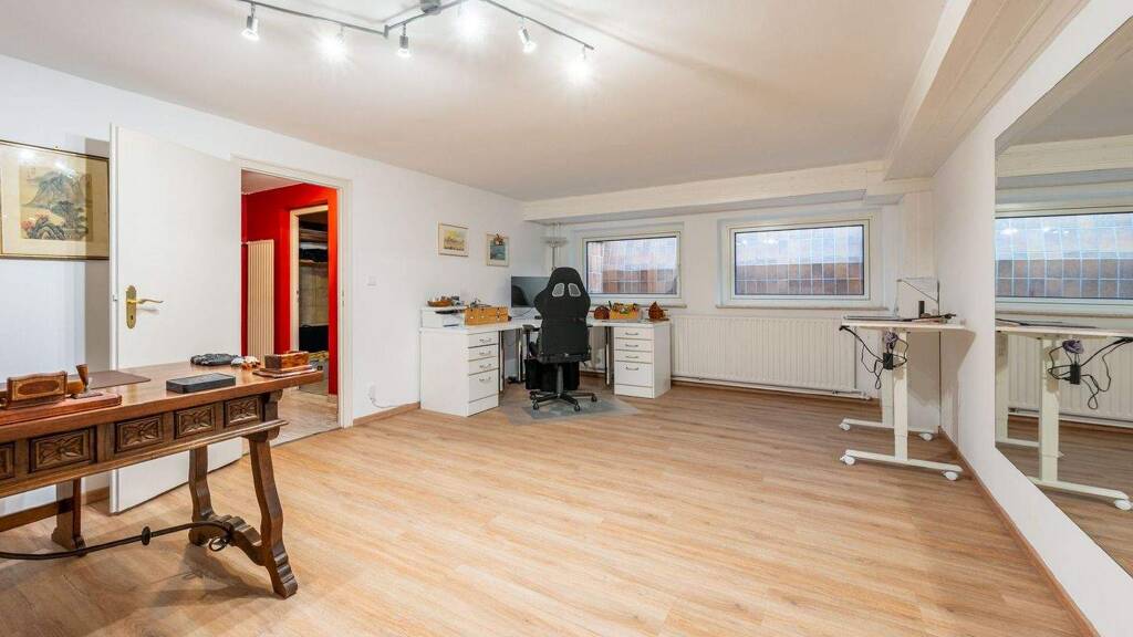 Das Erdgeschoss empfängt mit einem Windfang und einem separaten Gäste-WC. Von der Essdiele aus erschließen sich die Küche sowie das Wohnzimmer, das durch den direkten Zugang zur großzügigen Terrasse einen fließenden Übergang in den Garten bietet. Im Obergeschoss stehen eine Diele, drei gut geschnittene Schlafzimmer sowie zwei Badezimmer zur Verfügung und bieten ausreichend Platz. Das Kellergeschoss ergänzt das Raumangebot durch einen großzügigen Hobbyraum, eine Diele, einen Elektroraum, zwei weitere Kellerräume sowie einen separaten Heizungsraum. Darüber hinaus besteht die Möglichkeit, das Studio im Dachgeschoss auszubauen und zusätzliche Wohnfläche zu schaffen.