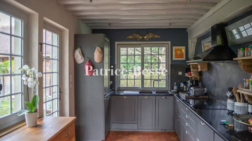 With approximately 80 m², this floor features a series of adjacent dual-aspect rooms, which all give on to the garden, while its front door opens on to a fitted kitchen bathed in light by wide windows. With a door leading directly to the garden, this room precedes a living room, the farmhouse's central space, with a terracotta tile floor, stone fireplace as well as painted ceiling beams, which echo its half-timbered walls.